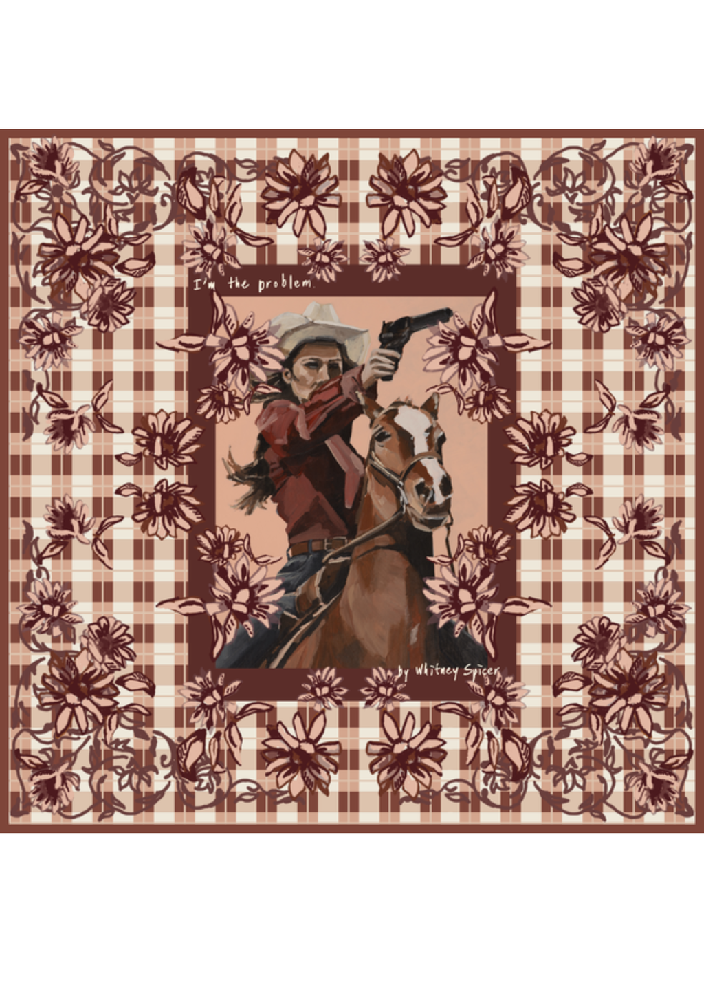 The Pistol + Petal Bandana/Scarf is a statement piece that blends FAR MER’s bold storytelling with feminine romance. At its centre sits the I’m the Problem artwork, framed by a gingham border and hand‑drawn floral motifs. Soft pinks and burgundy tones create a palette that feels both playful and powerful, making this bandana/scarf a versatile accessory with emotional resonance.