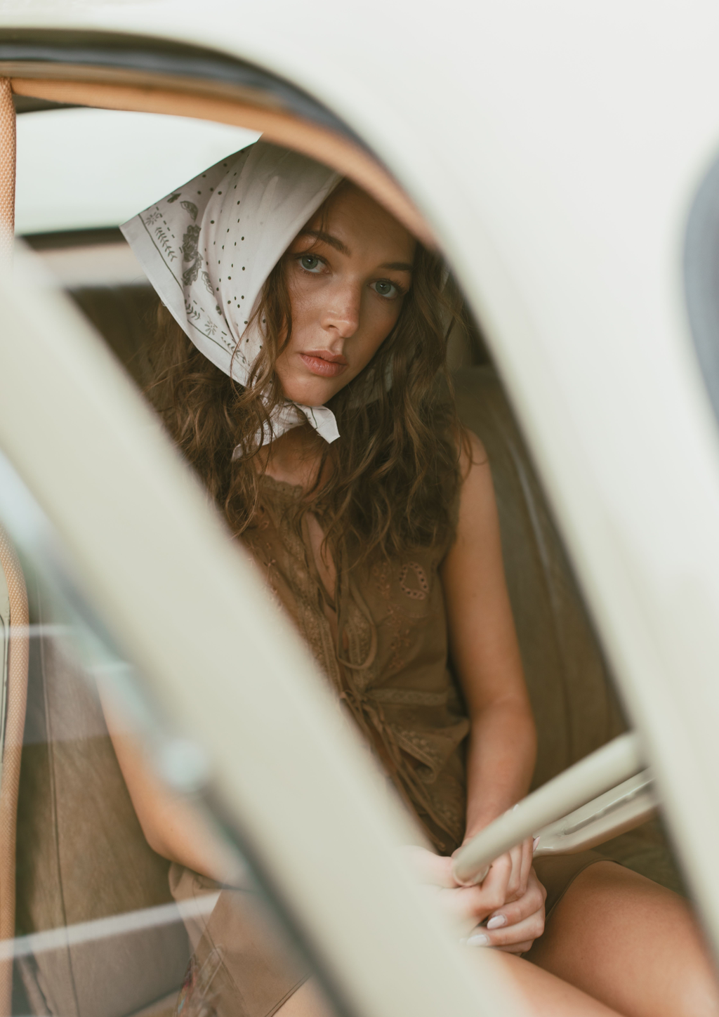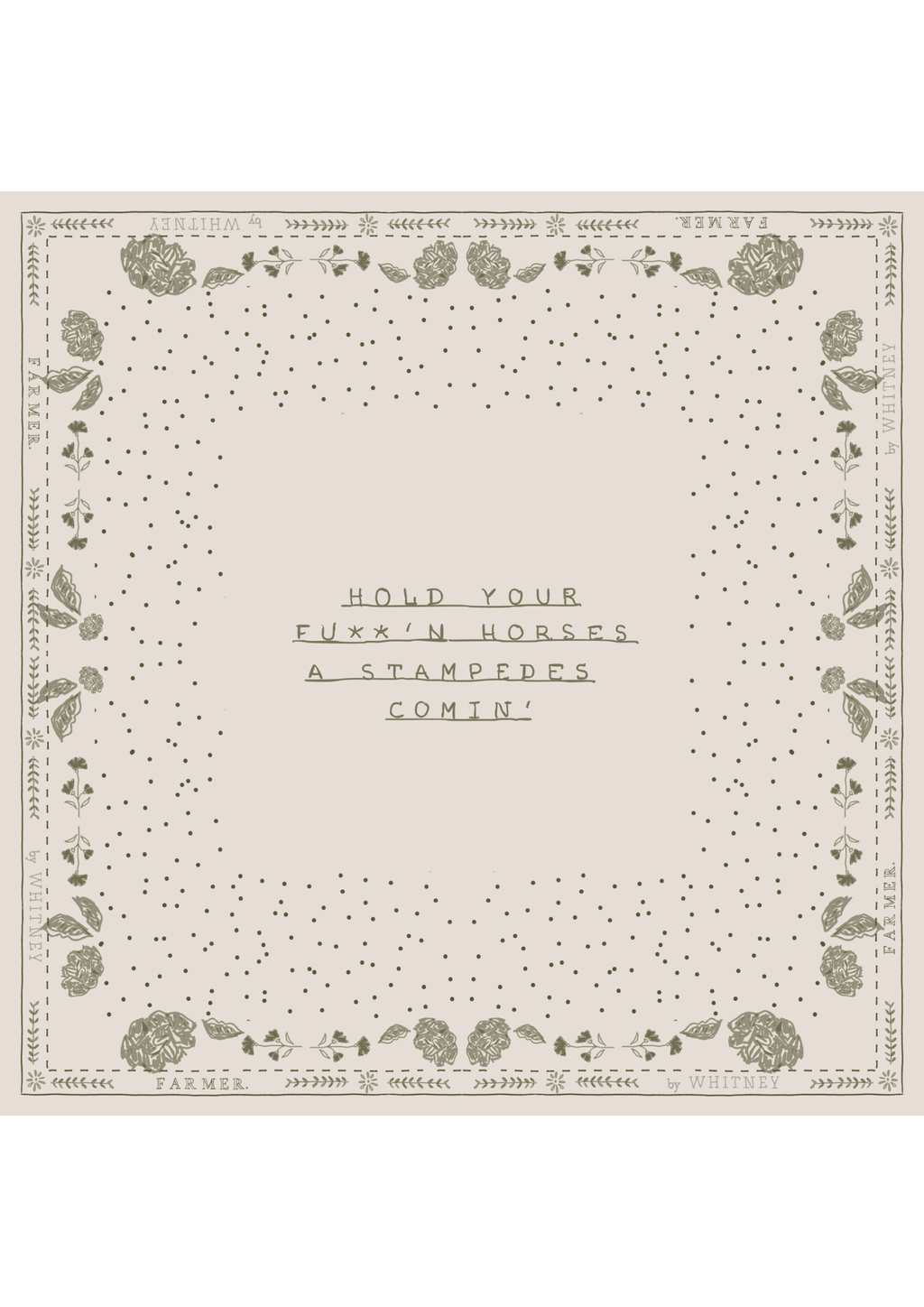 The Stampede Bandana Scarf is a striking accessory that captures FAR MER’s playful irreverence and romantic artistry. Crafted in champagne silk, this piece features hand‑drawn floral artwork by Whitney Spicer encircling the bold statement: “Hold your Fu**’n horses, a stampede’s comin’." A green tonal embroidery trim frames the design, adding texture and heirloom detail to its luxurious drape.